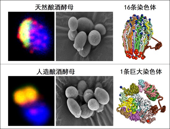 人造單染色體酵母與天然酵母細胞對比圖,兩者形態(tài)相似,但染色體的三維結構有巨大改變。中國科學院分子植物科學卓越創(chuàng)新中心/植物生理生態(tài)研究所供圖