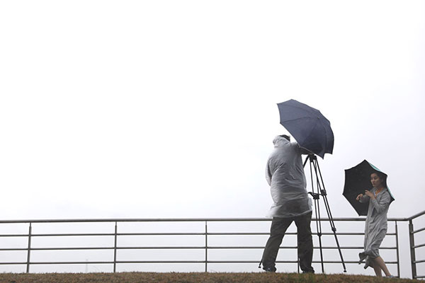 新華社記者邰劍秋、姜雪蘭在上海青草沙水庫頂著風(fēng)雨做連線直播。