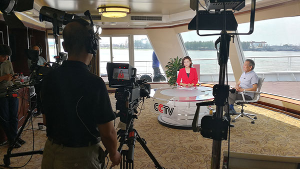 中央電視臺在客輪上搭建的移動演播室正在直播。