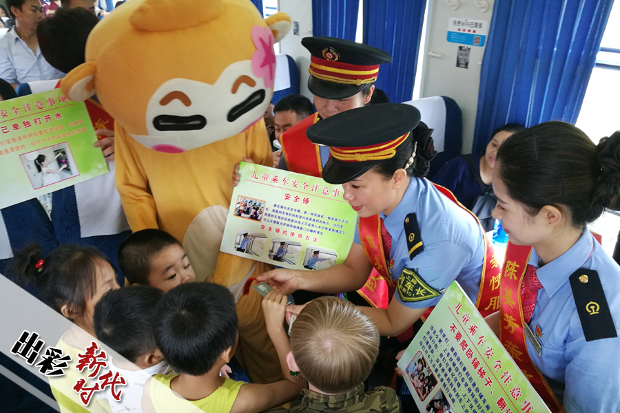 陳美芳(右二)正在開展“跟著安安坐火車”列車安全知識宣傳活動。本人供圖