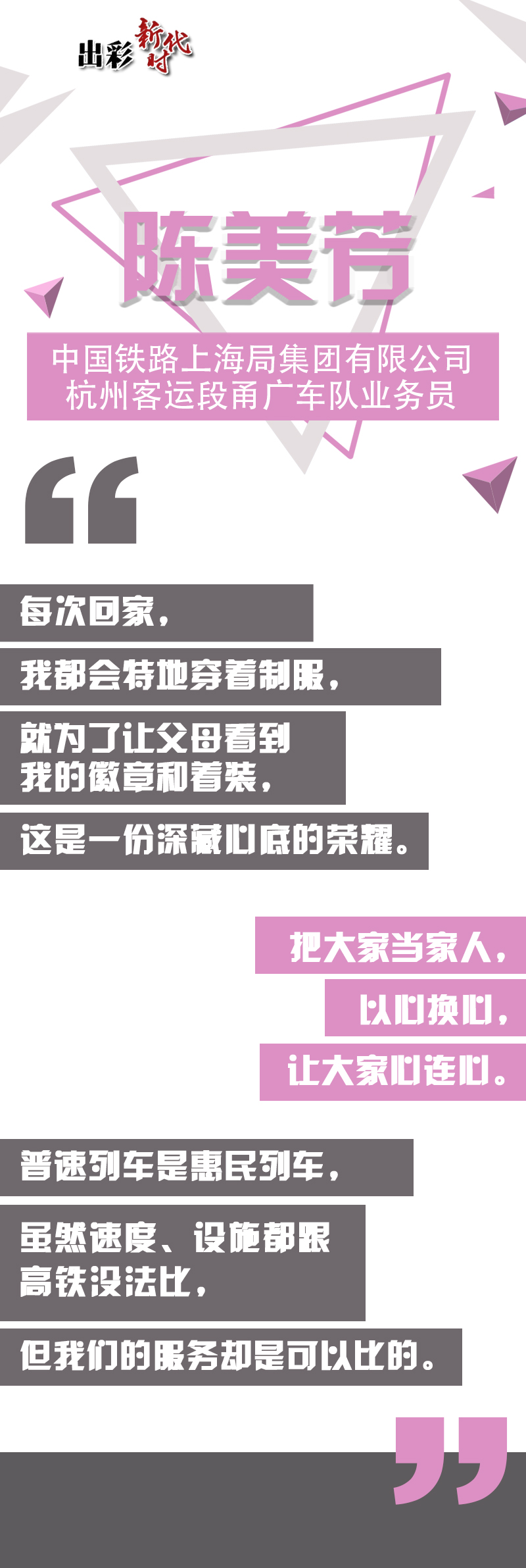 陳美芳是杭州客運段甬廣車隊的業務員,曾做過10年列車長的她,把一件件不起眼的小事辦成了大事,把普速列車變成了惠民列車。多年來,她把乘客遇到的不便和小事記在小本上,解決這些“小事”,就是她心中“比什么都重要”的大事。乘客說:“這車慢,但慢有慢的人情味,慢有慢的風景?!?