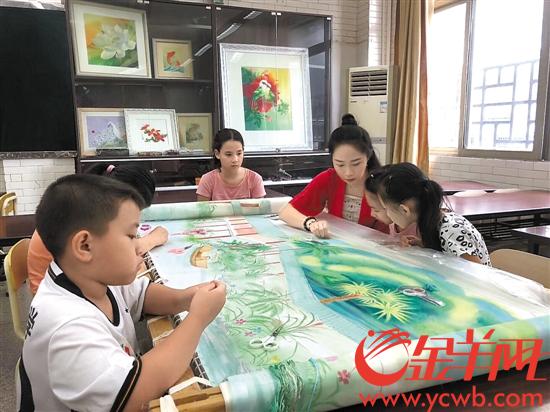 在廣州市荔灣少年宮,一群10歲左右的學(xué)生和一位20來歲的女孩正圍坐在一幅自然山水繡布前,女孩兩手時(shí)而靈活地穿針引線,時(shí)而放下針線,摸摸孩子們的小腦袋,抓起孩子們的小胖手,細(xì)心細(xì)語(yǔ)地說:“平常我們都用‘直紋直針’繡,如果要繡水紋,就要用‘稀疏針’了,直的地方保持平衡,波浪的地方就要打斜一點(diǎn)點(diǎn)……”