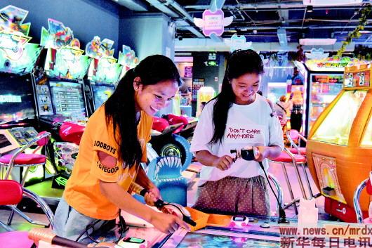 2018年8月21日,成都春熙路,阿來阿呷(右)和爾古依呷第一次體驗(yàn)電玩。