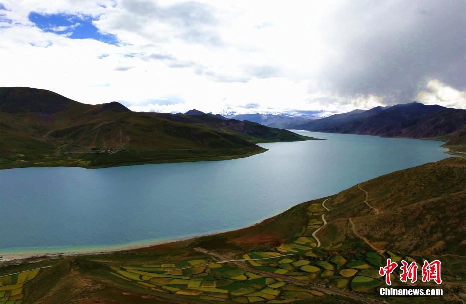 圖為西藏山南市浪卡子縣羊卓雍措邊成熟的青稞地。 中新社記者 趙延 攝