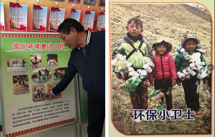 圖左為昂塞鄉(xiāng)鄉(xiāng)長(zhǎng)旦增文秀向記者介紹“垃圾換文具”活動(dòng),圖右為學(xué)校評(píng)選出的“環(huán)保小衛(wèi)士”。人民網(wǎng)記者 余璐攝