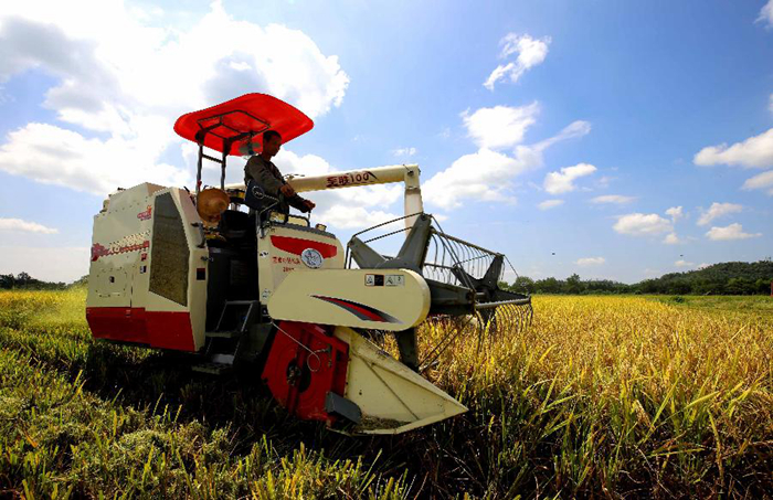 8月22日,江西省靖安縣仁首鎮(zhèn)石下村農民駕駛農機收割中稻。新華社發(fā)(徐仲庭 攝)