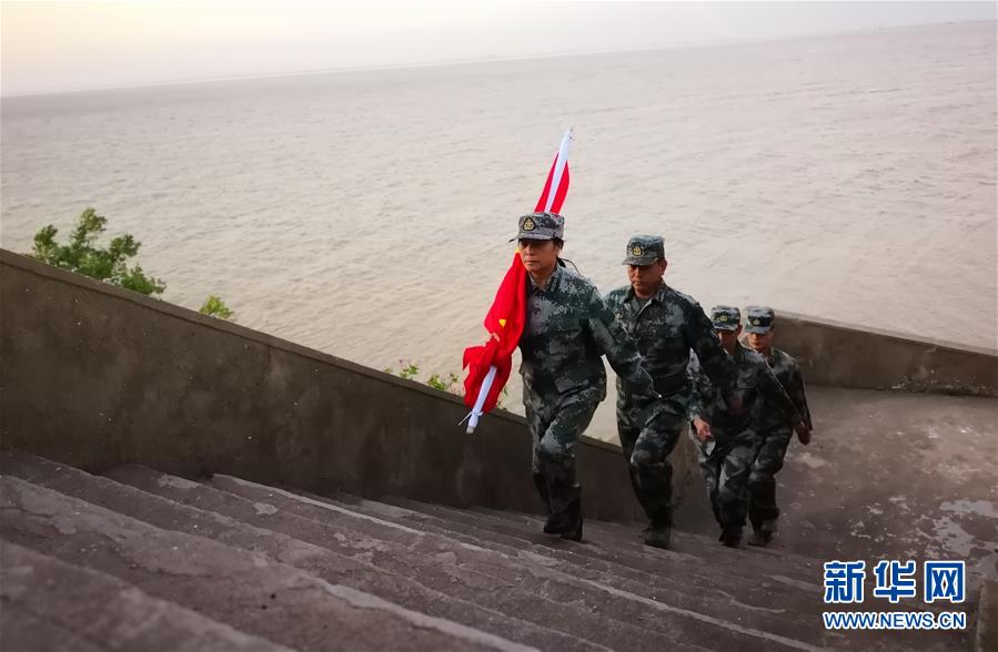 “1-2-1,1-2-1……”56歲的王仕花帶著3名守島民兵,迎著晨曦,肩扛國旗,向山頂的升旗臺走去。