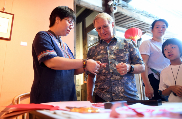 10月3日,在福建福州三坊七巷舉行的非遺剪紙展上,福州楊橋中學英語老師潘力鷹(左)在向美國客人講解中國的民間剪紙藝術。當日是國慶假期的第三天。新華社記者 林善傳攝