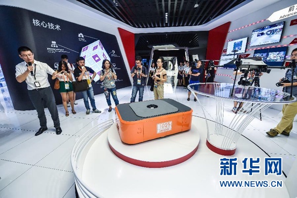 杭州海康威視數字技術股份有限公司工作人員向記者介紹公司研發的物流機器人(2016年9月2日攝)。新華社記者 徐昱 攝