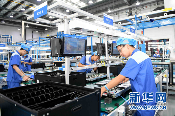 員工們在浪潮高端容錯計算機(jī)產(chǎn)業(yè)基地生產(chǎn)線上工作(6月14日攝)。 新華社記者 朱崢攝