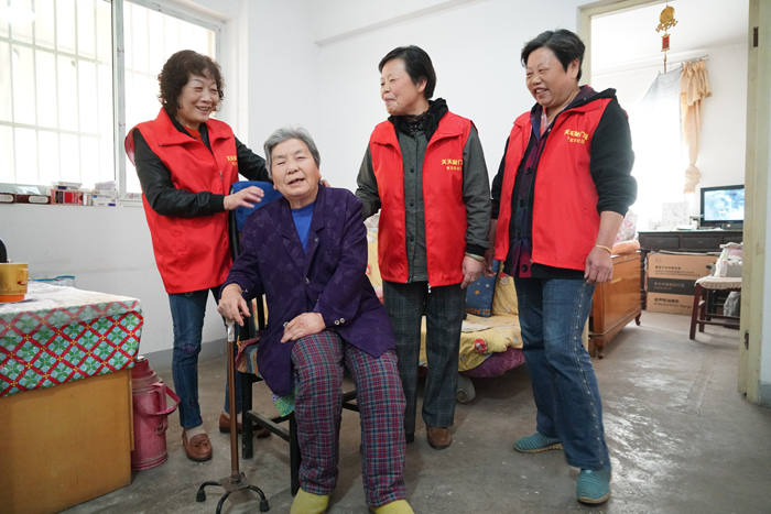 和王美華老人一樣,72歲的蔣桂梅也是一名獨居老人。經歷喪夫之痛的她搬進新居后,陌生的環境、生疏的鄰里,讓她十分不適應,經常閉門不出。“天天敲門組”多次上門探望后,她也決定加入志愿者隊伍。從“被敲門”到如今青和居第一網格黨支部書記,蔣桂梅說自己“活得更有意義”。