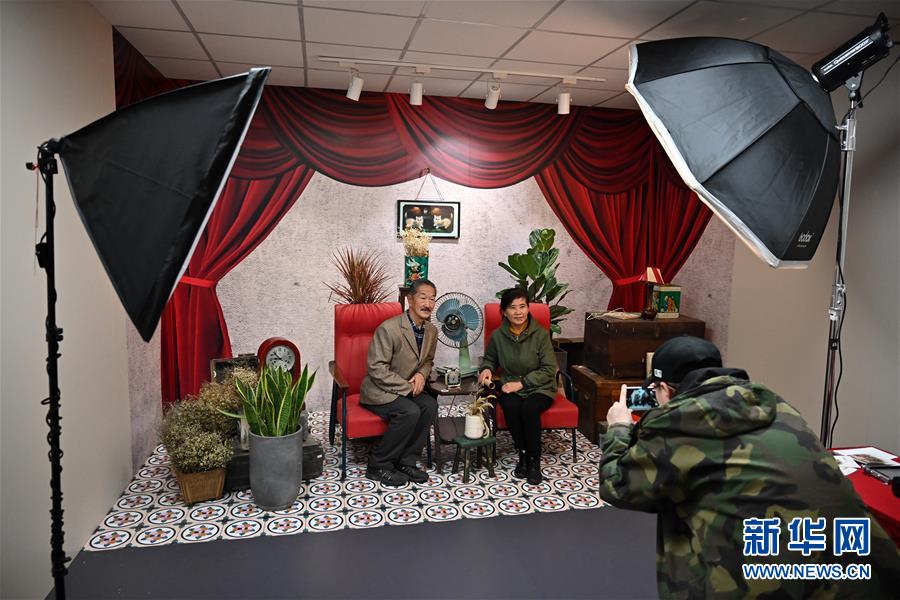兩名參觀者在“時光博物館”里的年代照相館拍照留念。新華社記者李鑫 攝