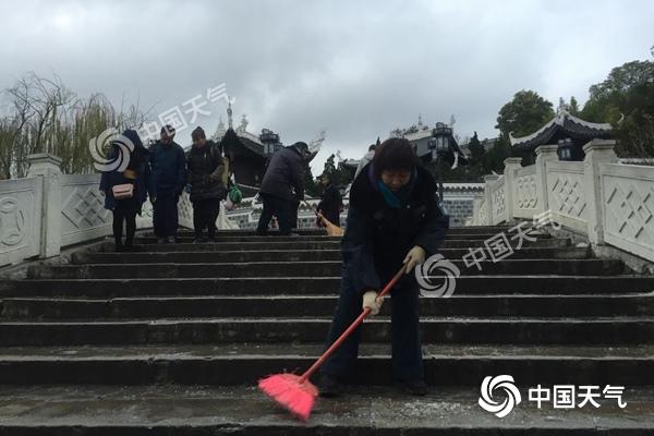 昨天上午,貴陽甲秀樓景區(qū)工作人員正在清掃浮玉橋上的結(jié)冰。(楊春竹 攝)