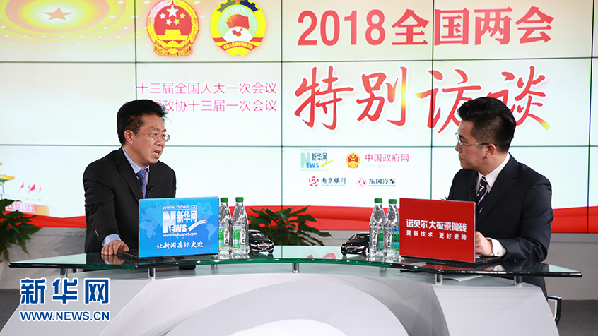 全國人大代表、中國人民銀行鄭州中心支行行長徐諾金(左)做客新華網2018全國兩會特別訪談。新華網楊锘攝