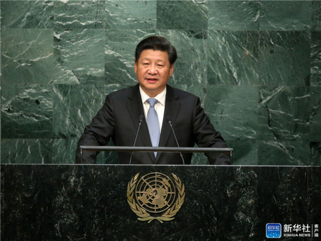 2015年9月28日,習近平在紐約聯(lián)合國總部出席第70屆聯(lián)合國大會一般性辯論并發(fā)表題為《攜手構(gòu)建合作共贏新伙伴 同心打造人類命運共同體》的重要講話。新華社記者 龐興雷 攝