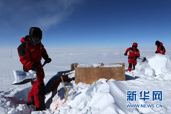 1月5日,科考隊員在清理昆侖站冰芯房外圍積雪。新華社記者 劉詩平 攝