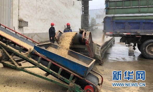 圖為安徽省鳳陽縣鳳臨糧貿有限公司卸糧現場。新華網汪亞/攝