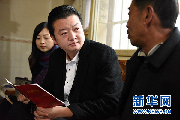 四川省敘永縣后山鎮三斗米村駐村第一書記胡凌鳴(中)在搬遷戶陳明中(右)家了解脫貧后的情況(1月15日攝)。新華社記者 謝佼 攝