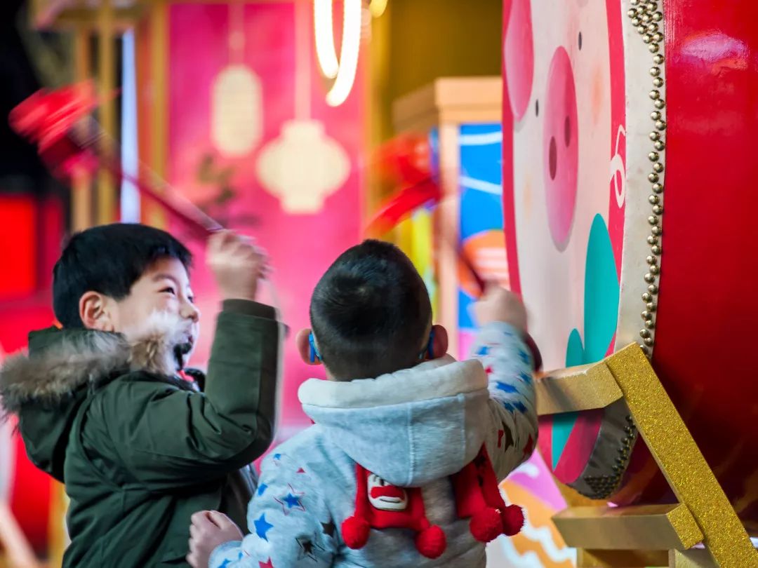 2019-02-01,上海市豫園商城。上海市豫園主題燈展的吉祥大鼓吸引了眾多游客,孩子們在家長的帶領下紛紛排隊上前擂鼓。作者:阿湯哥