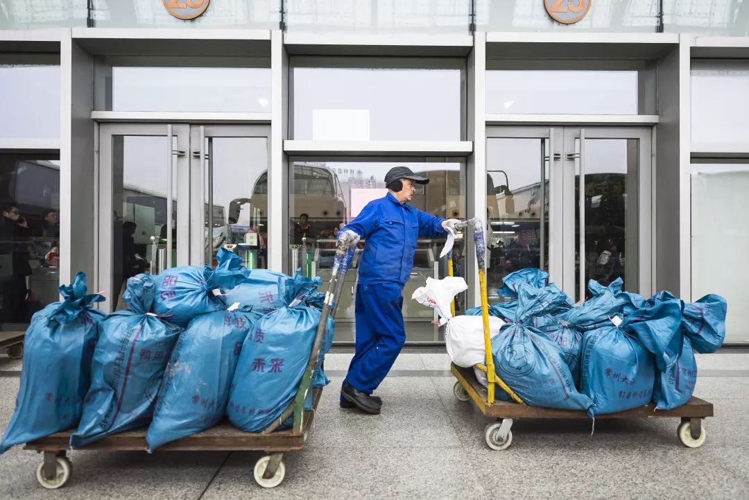 2019-02-01,江蘇省常州市。春運大軍中,客運站的貨物托運工正在托運貨物裝車。只見他驅動兩個小拖車同時行動,一下子運走了十幾個包裹。作者:全無敵