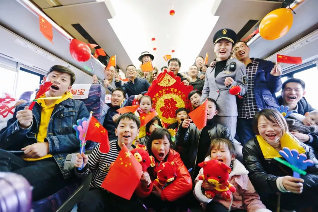 2019-02-03,江西省南昌市。D6503次列車上,列車乘務人員為了讓旅客返鄉旅程體驗更美好,精心布置車廂,為旅客派發福袋、糖果并合影留念。作者:嗯叮