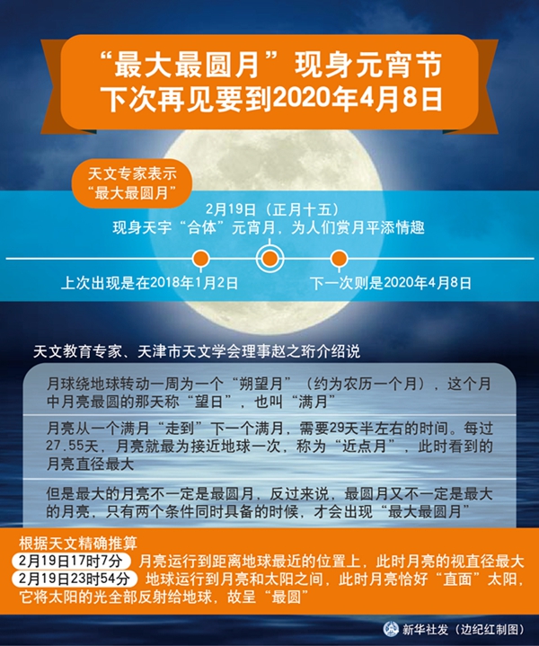 新華社天津2月19日電(記者周潤健)年度“最大最圓月”19日(正月十五)現(xiàn)身天宇“合體”元宵月,為人們賞月平添情趣。天文專家表示,“最大最圓月”上次出現(xiàn)是在2018年1月2日,下一次則是2020年4月8日。