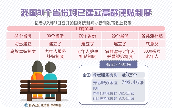 新華社北京2月21日電(記者羅爭光)記者從21日召開的國務(wù)院新聞辦新聞發(fā)布會上獲悉,目前全國31個省份均已建立高齡津貼制度。與此同時,有30個省份建立了老年人服務(wù)補貼制度,29個省份建立了老年人護理補貼制度,29個省份建立了農(nóng)村留守老年人關(guān)愛服務(wù)制度,各類津補貼共惠及3000多萬老年人。