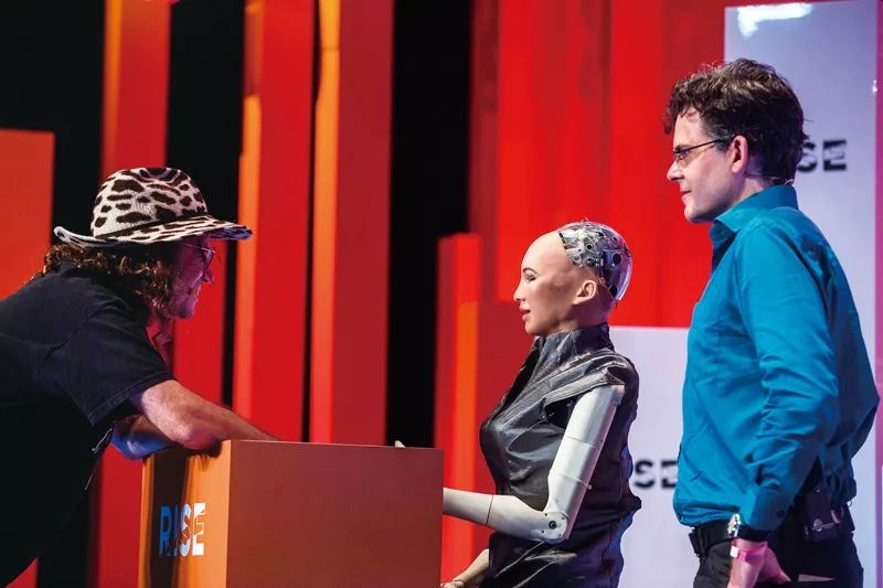 2017年10月,在沙特阿拉伯首都利雅得舉行的“未來投資倡議”大會上,機器人索菲亞被授予沙特公民身份,她也因此成為全球首個獲得公民身份的機器人。圖為2018年7月10日,在香港會展中心,機器人索菲亞亮相主舞臺。 ISAAC LAWRENCE/視覺中國