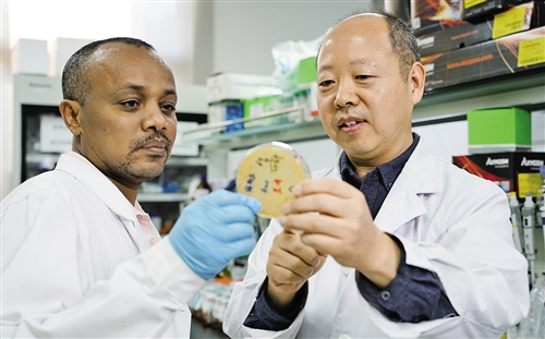 真菌學國家重點實驗室的科研人員(右)在指導埃塞俄比亞留學生分離和鑒定酵母菌。 趙小平攝 (中經視覺)