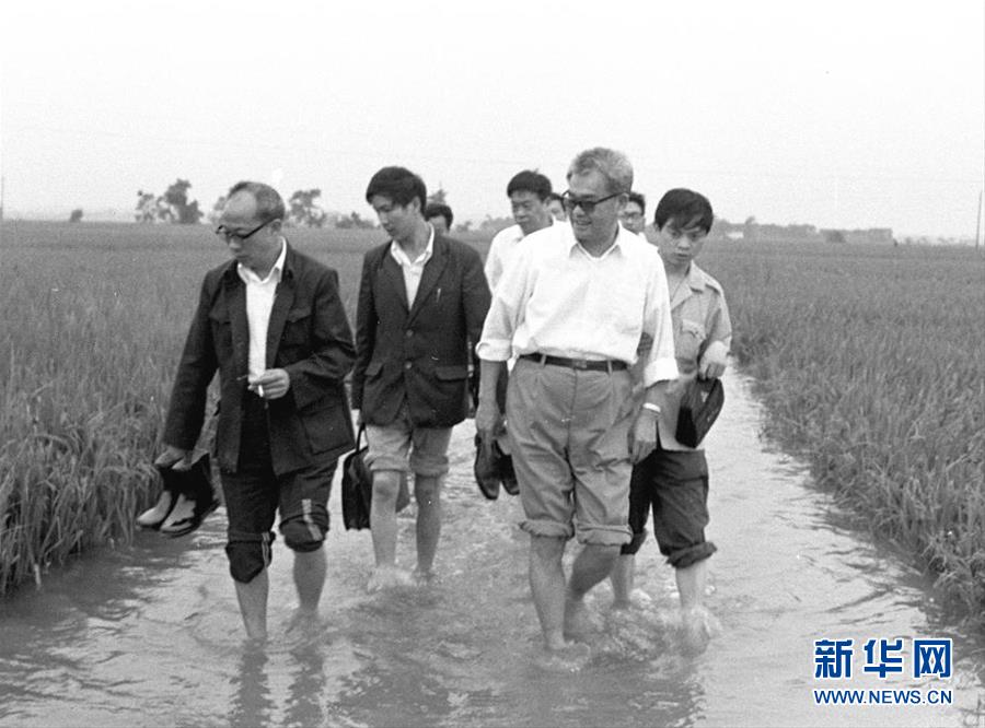 1989年7月,毛致用同志在江西省樟樹市和基層干部一起察看水稻受淹情況。 新華社記者王紹業攝