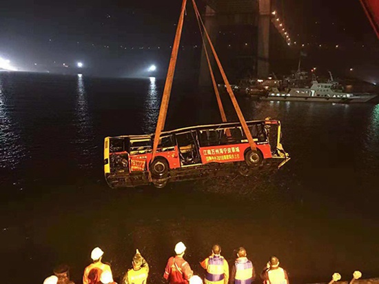 重慶萬州墜江公交車被吊起