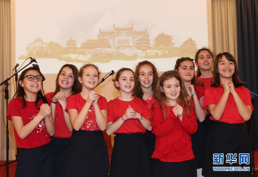 這是2019年2月8日,在意大利拉齊奧的古鎮蒂沃利,蒂沃利國立住讀學校的學生們在中國春節慶?;顒由辖o大家拜年。 新華社記者 程婷婷 攝