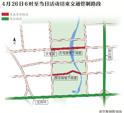 4月23日0時至4月26日活動結(jié)束,由北辰西路與大屯路交叉口(不含)經(jīng)大屯路、天辰西路、大屯北路(不含)、湖景東路、國家體育場北路、景觀大道、慧忠路、天辰西路至大屯路以內(nèi)區(qū)域道路,除持有“高峰論壇”專用證件的車輛外,禁止其他車輛通行。