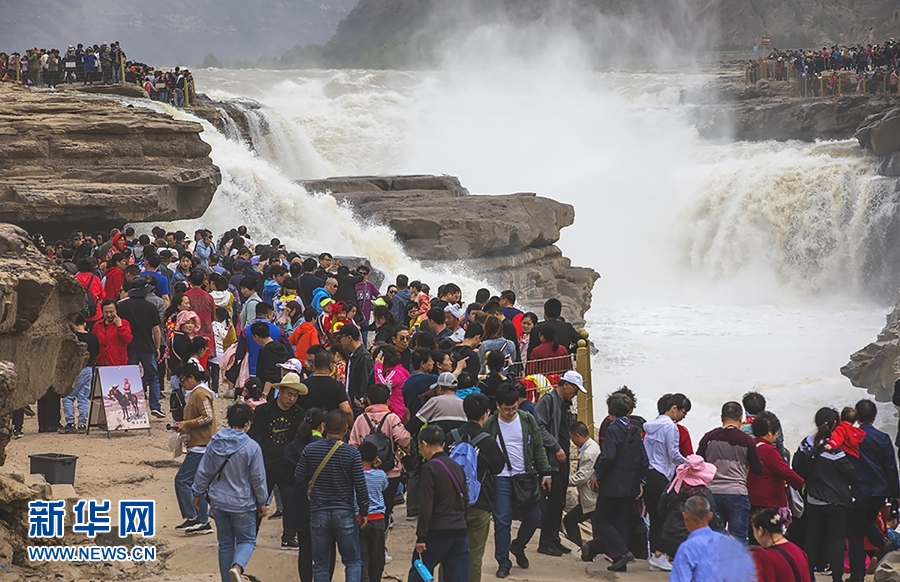5月3日,游人在位于陜西宜川縣的黃河壺口瀑布景區游覽。 新華社發(蘭華 攝)