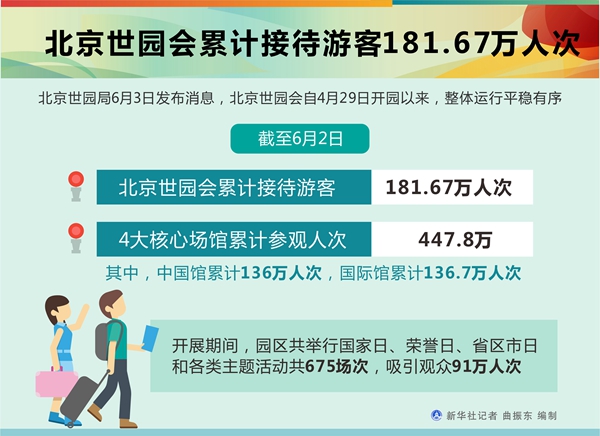 新華社北京6月3日電(記者魏夢佳、丁靜)北京世園局3日發布消息,北京世園會自4月29日開園以來,整體運行平穩有序。截至6月2日,北京世園會累計接待游客181.67萬人次,4大核心場館累計參觀人次達447.8萬。