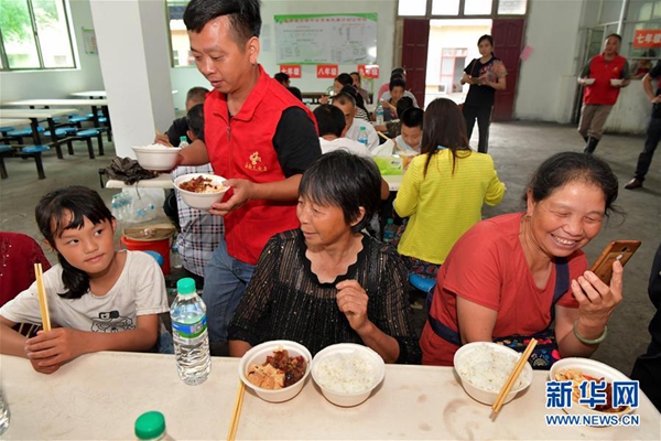 6月9日,在江西省吉安市永新縣高橋樓鎮高橋中學安置點內,志愿者為受災村民端來熱飯熱菜。新華社記者 彭昭之 攝