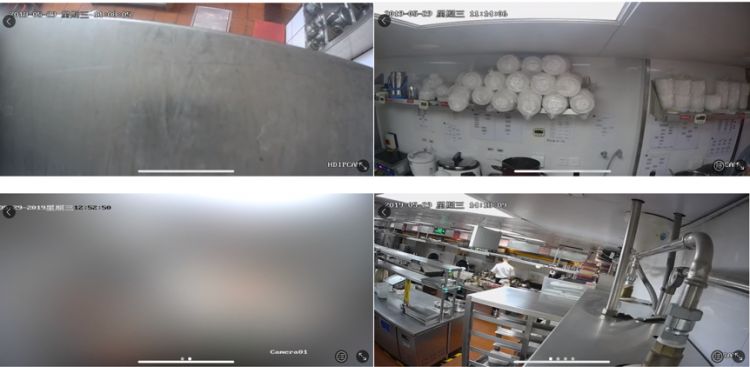 5月29日,“海淀陽光餐飲”APP上,味千拉面(SOGO本館店)、西少爺(復(fù)興門店)、成都小吃(西便門內(nèi)大街)、那家小館百盛店,均存在攝像頭被遮擋、角度對不準(zhǔn)或拍不到廚師工作的現(xiàn)象。圖片來源:新華社客戶端