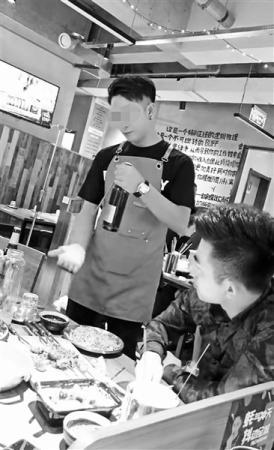 北青報記者在其中一則視頻中看到,一名餐廳服務人員當著一桌食客掏出一根準備好的筷子,左手持酒瓶,右手將筷子的一端頂住啤酒瓶蓋并換至左手扶穩,然后右手手掌一推,瓶蓋隨即崩開,整個過程僅幾秒鐘。