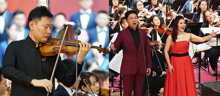 擔(dān)任《梁?!沸√崆侏?dú)奏的陳曦(上左),17歲就獲得第12屆柴可夫斯基國(guó)際音樂(lè)比賽小提琴銀獎(jiǎng),那屆金獎(jiǎng)可是空缺的哦。青年男高音歌唱家王傳越(右圖左)曾獲2015年第15屆柴可夫斯基大賽銀獎(jiǎng),女高音歌唱家宋元明(右圖右)曾獲第48屆法國(guó)圖盧茲國(guó)際聲樂(lè)大賽第一名。