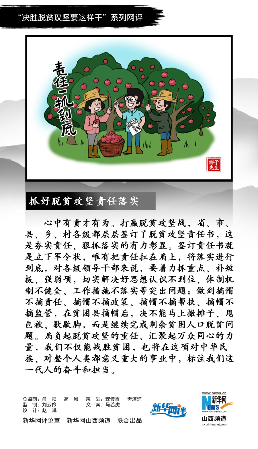 心中有責才有為。打贏脫貧攻堅戰,省、市、縣、鄉、村各級都層層簽訂了脫貧攻堅責任書,這是夯實責任、狠抓落實的有力彰顯。簽訂責任書就是立下軍令狀,唯有把責任扛在肩上,將落實進行到底。對各級領導干部來說,要著力抓重點、補短板、強弱項,切實解決好思想認識不到位、體制機制不健全、工作措施不落實等突出問題;做到摘帽不摘責任、摘帽不摘政策、摘帽不摘幫扶、摘帽不摘監管,在貧困縣摘帽后,決不能馬上撤攤子、甩包袱、歇歇腳,而是繼續完成剩余貧困人口脫貧問題。肩負起脫貧攻堅的重任、匯聚起萬眾同心的力量,我們不僅能戰勝貧困,也將在這項對中華民族、對整個人類都意義重大的事業中,標注我們這一代人的奮斗和擔當。(馬若虎)