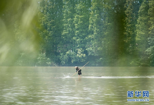 新華社杭州7月11日電(記者商意盈) 江面浩渺,霧氣氤氳。11日上午,浙江新安江上,一根大約8米長的毛竹越江而來,毛竹上站立著一位身穿蓑衣、頭戴斗笠的精瘦男子。他用手中的細(xì)竹竿作槳,輕輕劃水,不多時,人已到江心。