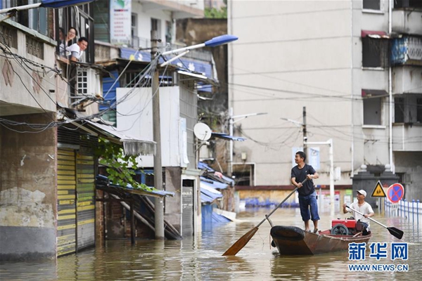 7月14日,湖南省永州市零陵區(qū)富家橋鎮(zhèn)漁池頭村發(fā)生洪澇災(zāi)害,有關(guān)部門迅速展開救援。新華社發(fā)(陳思汗 攝)