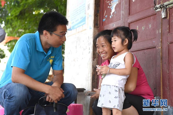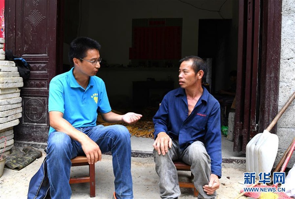 楊杰興(左)在廣西樂業縣百坭村向村民了解孩子讀幼兒園的情況(8月1日攝)。新華社記者 周華 攝