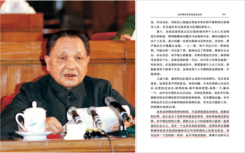 鄧小平同志高度重視堅(jiān)持和加強(qiáng)黨的領(lǐng)導(dǎo),旗幟鮮明地指出中國(guó)共產(chǎn)黨是社會(huì)主義現(xiàn)代化事業(yè)的領(lǐng)導(dǎo)核心,在改革開(kāi)放和現(xiàn)代化建設(shè)中,必須始終堅(jiān)持黨的領(lǐng)導(dǎo),加強(qiáng)和改進(jìn)黨的建設(shè)。左圖為鄧小平同志在中國(guó)共產(chǎn)黨第十二次全國(guó)代表大會(huì)上致開(kāi)幕詞(新華社記者 錢(qián)嗣杰/攝);右圖為鄧小平同志有關(guān)堅(jiān)持和加強(qiáng)黨的領(lǐng)導(dǎo)的重要論述。