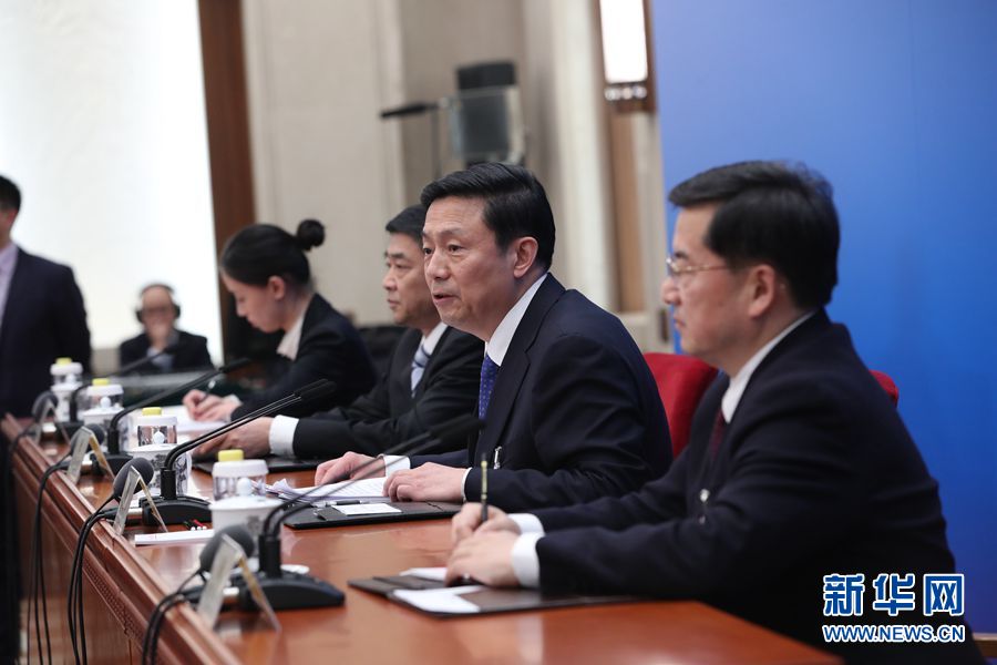 全國政協(xié)十三屆二次會議新聞發(fā)布會于3月2日15:00在人民大會堂一層新聞發(fā)布廳召開,大會新聞發(fā)言人郭衛(wèi)民向中外媒體介紹本次大會有關情況并回答記者提問。圖為新聞發(fā)言人郭衛(wèi)民(右二)介紹本次大會有關情況。新華網(wǎng)/中國政府網(wǎng) 翟子赫 攝