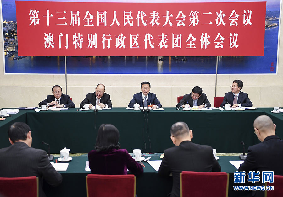 韓正分別參加了香港代表團、澳門代表團審議。韓正與香港、澳門地區全國人大代表進行了親切交流。在充分肯定港澳發展取得的成績后,韓正指出,粵港澳大灣區建設的一個重要戰略考量,是推進“一國兩制”事業發展,保持香港、澳門長期繁榮穩定。香港、澳門要發揮獨特優勢,積極參與粵港澳大灣區建設,在融入國家發展大局中實現自身更好發展。港澳地區全國人大代表是愛國愛港、愛國愛澳的中堅力量,要進一步發揮好雙重積極作用,為“一國兩制”事業作出新的貢獻。在香港代表團,韓正表示,香港在大灣區建設中作用特殊,將支持香港打造國際創新科技中心,鼓勵香港同胞特別是青年在大灣區創業就業,更好發揮香港專業服務在大灣區建設中的作用。希望香港地區全國人大代表帶頭維護“一國兩制”和憲法基本法權威,帶頭支持行政長官和特區政府依法施政,帶頭促進香港社會在愛國愛港旗幟下的大團結,帶頭參與香港與內地的交流合作。在澳門代表團,韓正表示,大灣區建設給澳門帶來了新機遇,將支持澳門拓展發展新空間,建設“一個中心”“一個平臺”,加快發展旅游、會展等產業,做好保障和改善民生工作,讓澳門居民在大灣區建設中得到更多實惠。希望澳門地區全國人大代表積極參與慶祝澳門回歸祖國20周年有關活動,積極支持特區政府換屆交接,積極推動經濟適度多元發展,積極關心幫助青年成長發展。