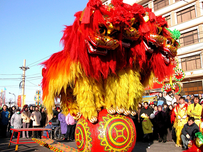 北京廠甸廟會上的獅子滾球表演。(圖片來源:東方IC)