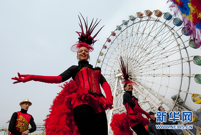 2015年2月19日,在北京石景山游樂園“迎春洋廟會”上,幾名外國演員參加盛裝巡游。(圖片來源:新華社 李文明 攝)