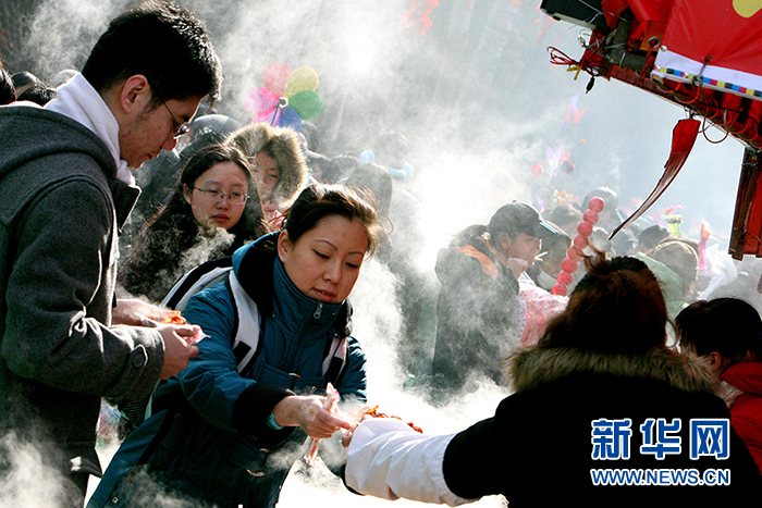 2008年2月6日,游客在北京地壇春節廟會上挑選風味小吃。(圖片來源:新華社 張迺杰攝)