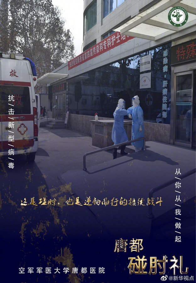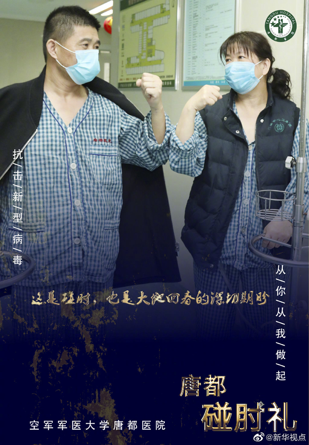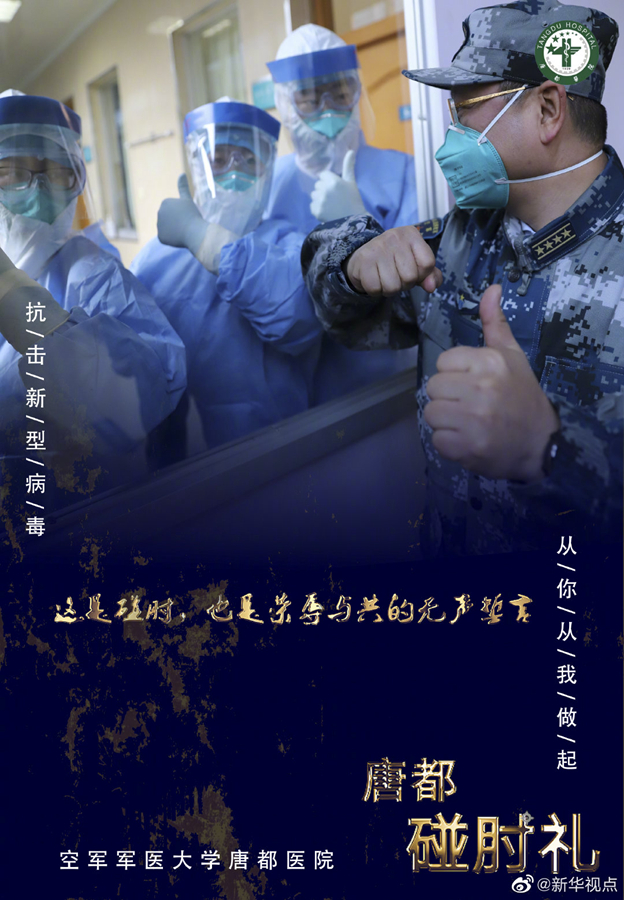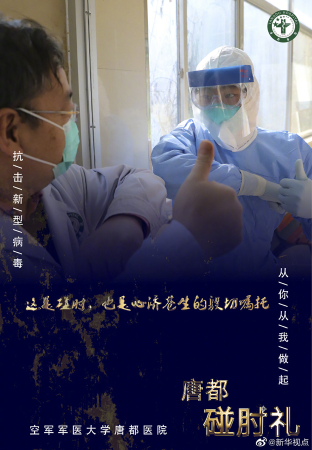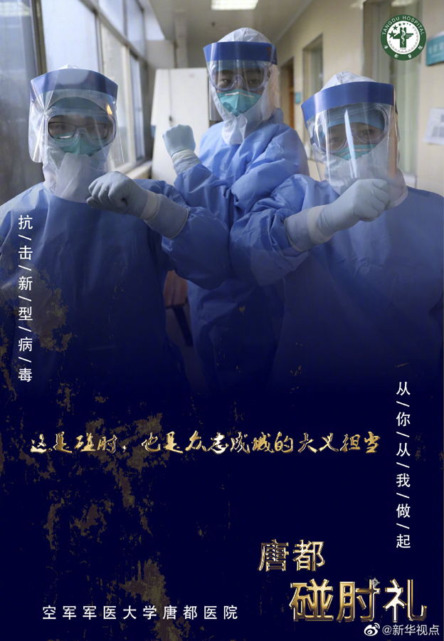 疫情當前,空軍軍醫大學唐都醫院的醫護人員在抗擊疫情的同時,用新的肢體語言——“碰肘禮”,相互問候,相互加油。肘碰肘,心連心,萬眾一心,定能戰勝病毒。(文字藺娟;圖片由空軍軍醫大學唐都醫院提供) ????